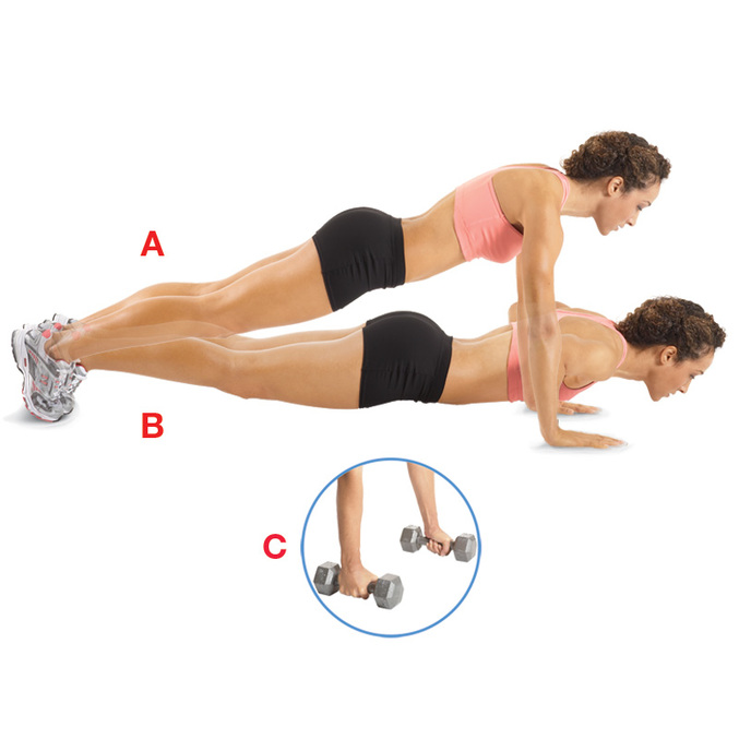 Делаем 60 - получаем 4 балла, 45 раз - 3 балла, 30 раз - 2 балла, 15 - 1 балл. Количество подходов может быть любым, хоть 20 подходов, растянутых на весь день по 3 раза за подход.ВАЖНО при выполнении корпус должен быть одной прямой, без прогибов и выставления попы домиком! Если есть возможность, смотрите на себя в зеркало или попросите группу поддержки следить за ровностью важего тела. Можно делать вариант А, можно усложнять (вариант С), т.е. отжиматься не от пола, а от гантелей, лежвщих на полу.