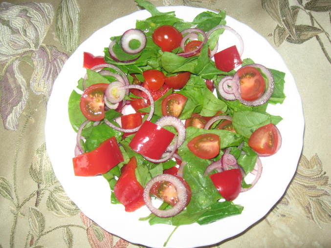 ужин: телячья тефтелька (большая), овощной салат (шпинат, помидор, перец,лук-см фото)