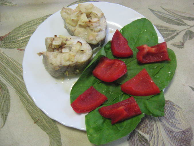 ужин: треска из духовки, листья шпината, половинка красного перца (см. фото)
