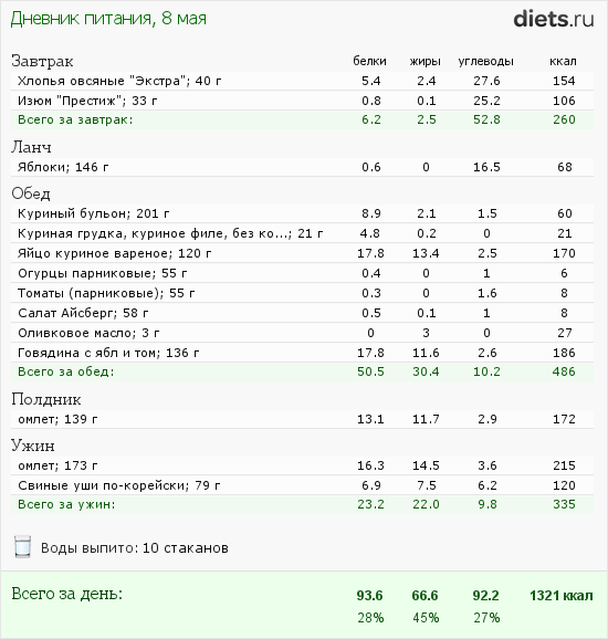По меню: на полдник творога не хотелось совсем! А ужин - приехали поздно и что то готовить себе не было времени ( тогда бы я не в 10 ужинала, а в лучшем случае в 11). А тут папа еще ушек купил, ммм ))) яичный день у меня сегодня! ))) В целом меню конечно отстойное, но хоть по калоражу нормально..