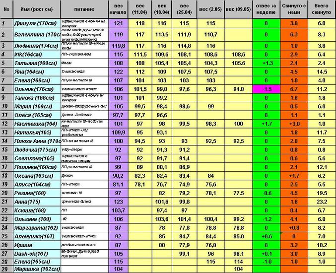 Марии табличку буду вести я. Так что жду сегодня от вас всех отчетов.Не забываем писать текущий вес и сколько скинуто за недельку. А так же просто общаемся.