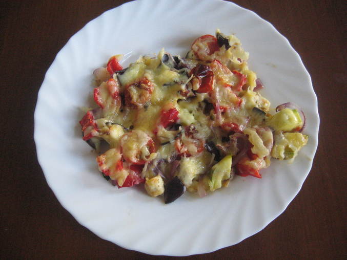 Все овощи режутся, потом в форму кладу, смазанную чуток маслом и в духовку, пока овощи не приготовятся, посыпать сыром и ещё на 2-3 минутки....;на самом деле всё быстро и вкусно...С баклажаном ничего не делала...