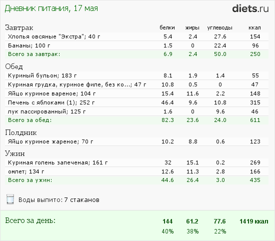 По меню: на обед много печени, оставлять 50 грамм был не вариант - доела... поэтому по калоражу нормально.. на завтрак изюм закончился, поэтому банан в кашу порезала.. На ужин - честно - не наелась 3 голенью ((( сварганила себе омлетик )) поэтому много жиров! по калоражу в свой коридор уложилась и то хорошо! )))