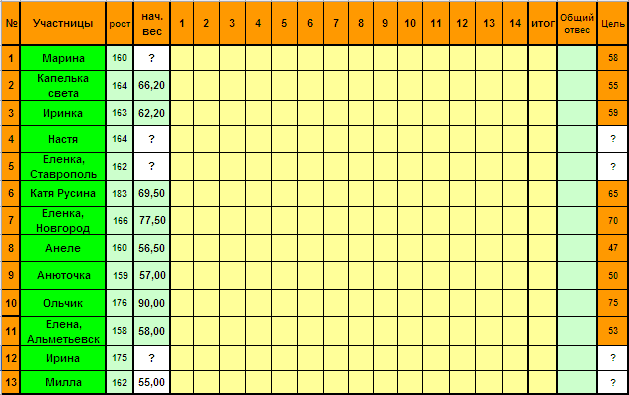 привет! я вчера с подружками встречалась, ели пиццу, суши и торт Наполеон ))) Сегодня +1 кг! Так что стартую с 59,8. Цель 55 кг