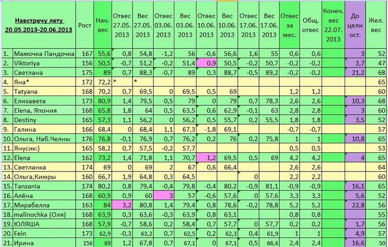 Приветик! Запишите меня в таблицу: вес 72,700 кг утром в понедельник. Итого минус 1 кг, хоть это радует ) Почти недел не занималась спортом, диеты нет, орви на нашу семь напало, так по-тихоньку прихожу в себя, вчера вот возобновила треннировки и начала обертованиями заниматься. Вот такие дела ) На счет продления я согласна, может че и получиться постройнеть ), мои травмир.ноги прошли наконец-то, купила кроссовки, теперь занятия надесь будут идти с пользой и удовольствием )