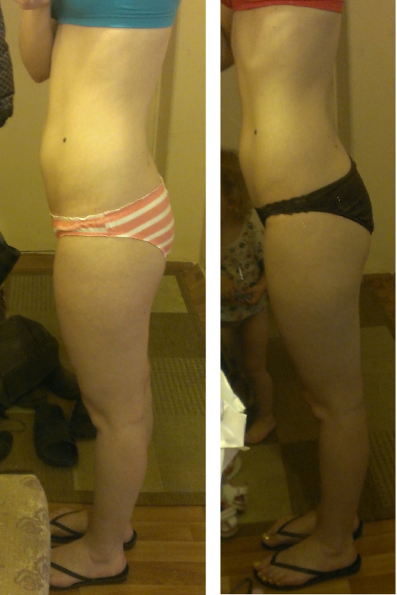 До этого я тоже худела, т.е. левое фото - уже промежуточный результат. Начало пути в фотках не сохранилось, но там был страх... Начинала с 59-60 кг. Рост 170. На левом фото 58,5, на правом 55,8 =)