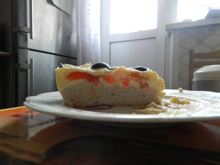 Взяла 500 г куриного фарша (можно любого, но калораж изменится соответственно), смешала с 1 яйцом, положила в чашу. Нарезала кружками 3 помидорки - положила сверху. Смешала 4 яйца, молоко и 150 г сыра - вылила сверху. Закинула маслин (просто стоят без дела в холодильнике - решила использовать) - но и без них будет вкусно! Режим "выпечка" на 45 минут - всё! ))