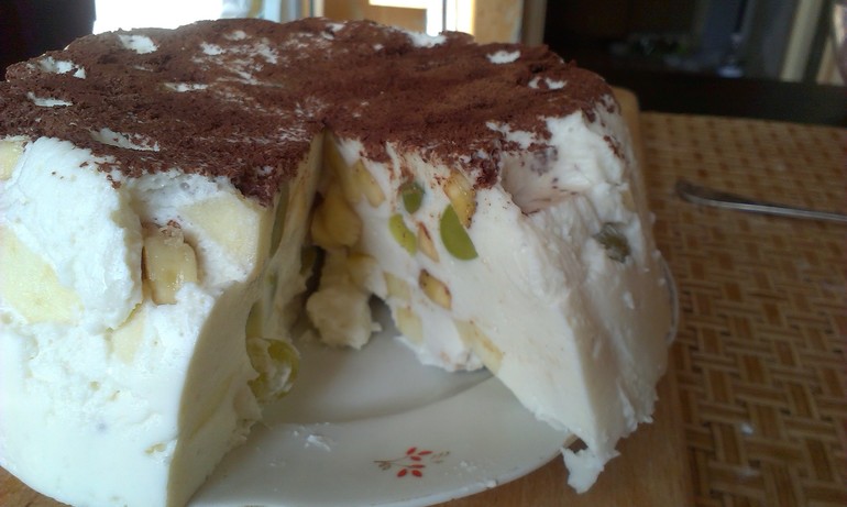 Заливаем весь желатин молоком и отставляем в сторону. Пока желатин набухает миксером смешиваем творог и сахар до однородной массы. Фрукты моем и нарезаем на кусочки. Желатин нагреваем до 50-60 градусов чтоб все растворилось (но не кипятим). Затем все смешиваем и заливаем в силиконовую форму и на ночь в холодильник.