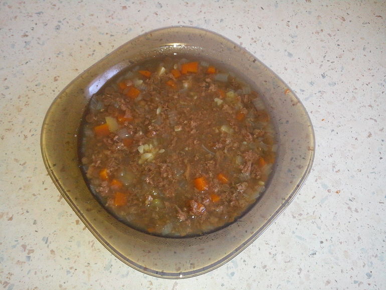 Обед: суп овощной с чечевицей, тушеная котлета внутри)))(делала себе как дочке)