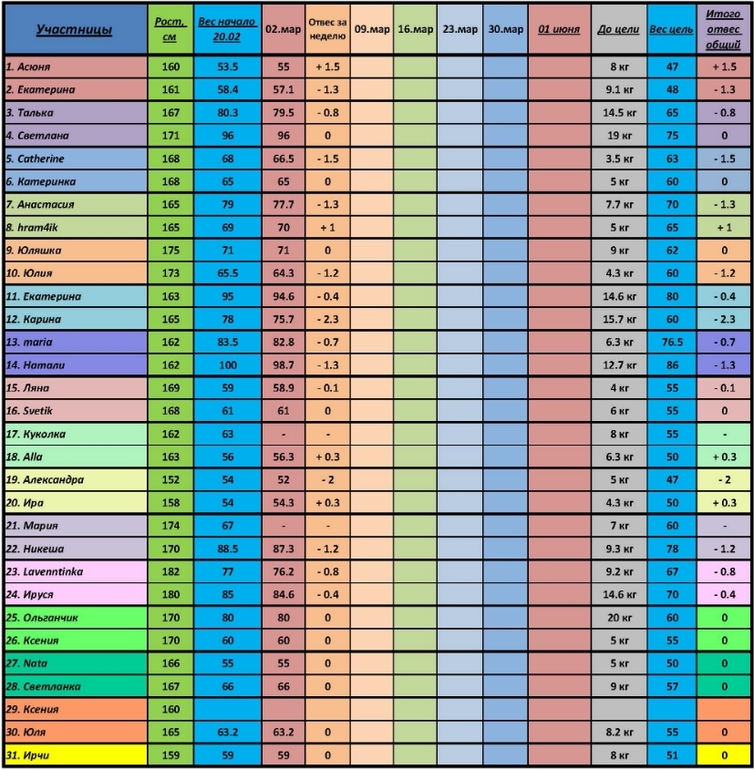 Стройнеем вместе(здесь пишем марафоны,которые уже идут, или предложения о марафоне)Доброе время суток,девчонки! :) Всех с прошедшим праздничком!!! Рассказывайте как прошла неделька ваша? У меня неделя прошла вообще без всего,делала дела и некогда было не заниматься,не мазюкаться кремами,за пианием не особо следила и даже не взвешивалась! :( Очень страшно встать на весы. Но на этом моя такая "не правильная программа" заканчивается,потому что,если муж сможет приехать,то мы играем свадьбу! ))) Вот стимул какой! :) Набора нет,потому что много участниц. Девочки,первую неделю не учитывала,кто не отчитался вовремя,потому что многие пост не нашли сразу. Сейчас есть информационный пост и я всем ссылку скинула! И отчитываемся под своим номером. :)