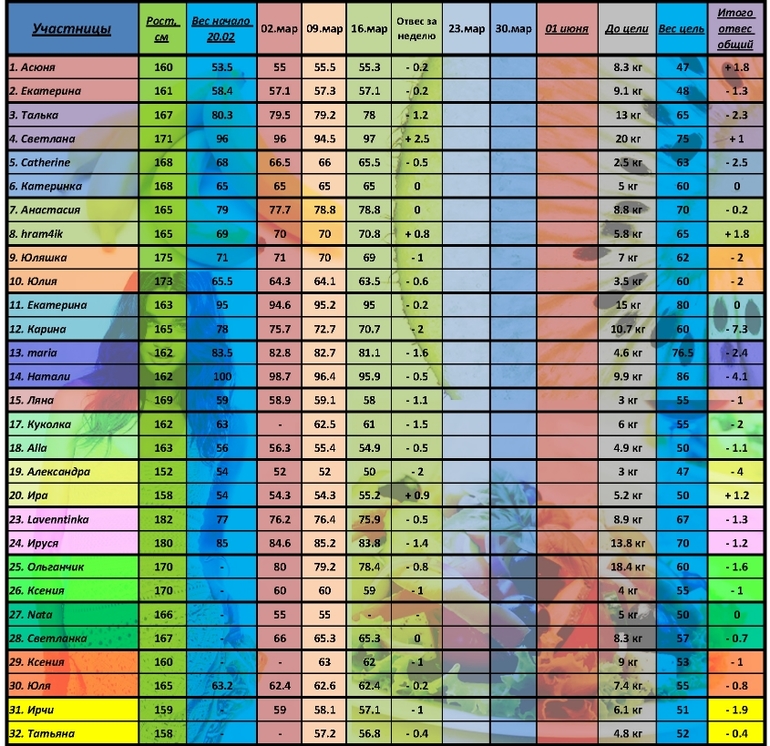 Прошу прощения, что потерялась. № 28 Вес 65,0.Неделя прошла продуктивно: ДМ, питание по Дюкану, постепенно уменьшаю количество еды, а то во время атаки муж упрекал меня, что у меня атака холодильника, а не жира. Надеялась на больший отвес, но впереди КД.