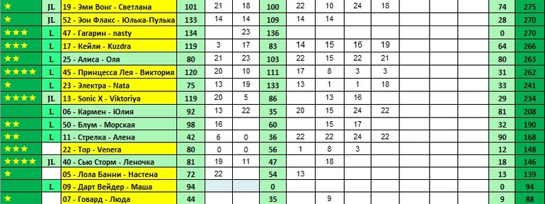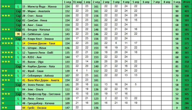 Питание-12Спорт-5 (12 000 шагов+кардио дм)Джокер-4 (а у нас на д/площадке как раз классики нарисованы, мы сегодня напрыгались с крошкой стичем)Уход-1 (скраб и АЦ крем)Итого: 22 + 2 бонусных