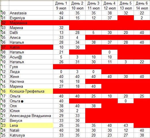 Под катом - табличка отчетов за первые 6 дней. Я думаю, что по результатам этой недели придётся просто поудалять "отключившихся совсем".