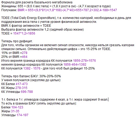 Дневники худеющихРешила я сегодня пересчитать свое КБЖУ, так как со спортом я так и не подружилась и до поездки (уезжаем 28 июля) уже точно не подружусь. Решила, что начну тренировки уже после того как вернусь с путешествия. Это будет 7 августа. Кроме того в расчете учла, что похудела на 1 кг. Вот что получилось (предыдущий расчет можно посмотреть тут).