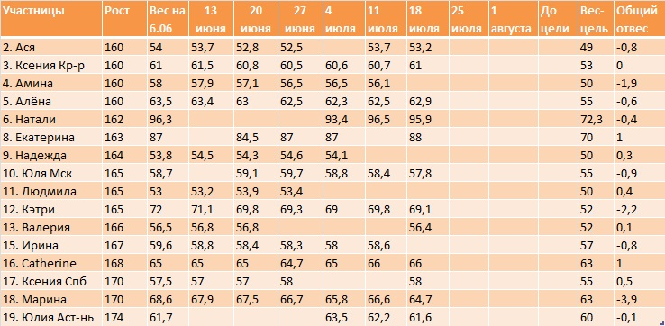 Так, темки за 1-е августа нет, так что пишу сюда. Мой вес сейчас 57,2, но пришли КД, так что рассчитываю на лучшие результаты;)