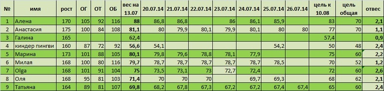 Привет, уезжали к моим родителям, поэтому отчитываюсь только сейчас.. 25.07 ушла в плюс :(( 78,0 было. 26.07 стало 77,9 опять.. Короче, топчусь на месте. Сегодня 27.07 вес такой же... Рада, что не сильно в плюс ушла, а то мама как наготовила курицы с картошкой, ммм, устоять не смогла)