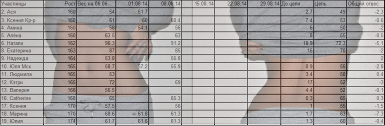На 1е августа мой вес был 65 насколько я помню, просто забыла сама себя внести в табличку)))На сегодняшний день 65,7. Отекла сильно. На ежедневные отчету согласна, хотя бы пару недель надо.