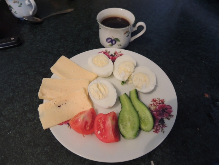 Мой завтрак-яйца вареные-2шт,сыр,огурец,помидор,кофе