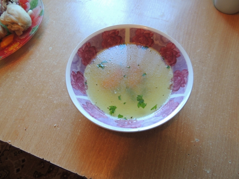 3.обед-бульен куринный с мяском+творог(в нем ложка чайная нежирной сметаны,малюсенький кусочек банана и сахара чуть,кофе