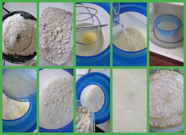 Перемолоть хлопья в муку, взбить яйцо с солью, добавить туда воду, подогретый кефир, всыпать муку. Взбить всё))).