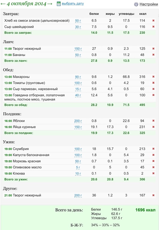 Да, а все потому что не спланировала меню заранее. Так проще учесть количество нутриентов по приемам пищи. Проспали.. Решила, что сыр и хлеб (угли+белок) быстрый и нормальный завтрак.. А потом приехали с мужем голодные очень. Муж попросил пасту, ну и я с ним за компанию. Вообще, макароны из твердых сортов — это хорошо, но в меньшем количестве. На завтрак не представляю.. Надо попробовать))! Да, косяков много!! Но благодаря этим постам и вашему вниманию, я дисциплинируюсь))!