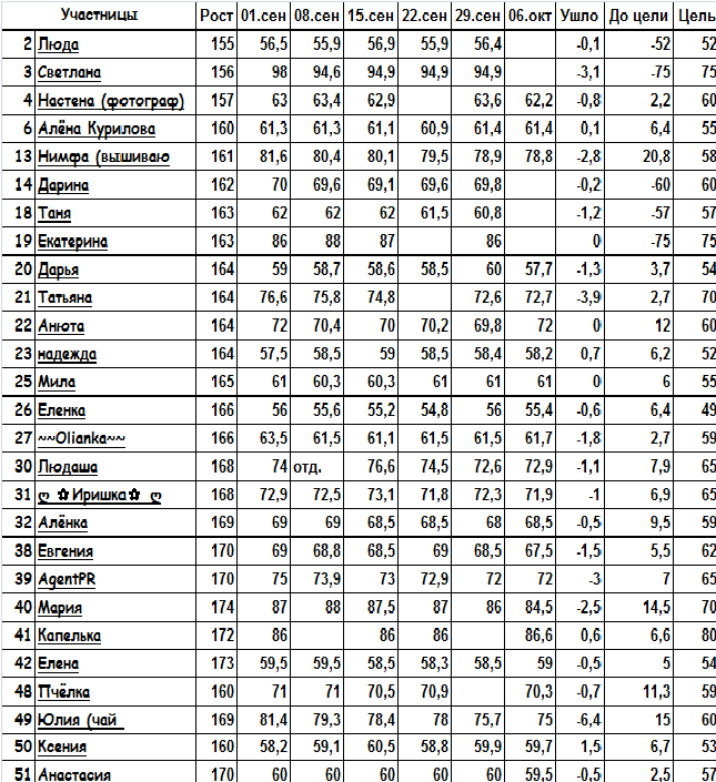 Давайте искать)) Если я правильно поняла, Ваш номер 47. У вас за все время записан только вес начальный, на первое сентября... В условиях марафона сказано, что если нет отчета в течении двух недель, то участник выбывает из марафона.