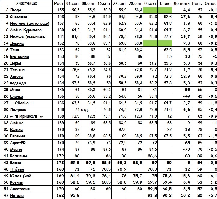 Еще хочу отметить участниц, вес которых на протяжении всех шести недель ни разу не поднимался! Нимфа и AgentPR уверенно идут вниз, молодцы