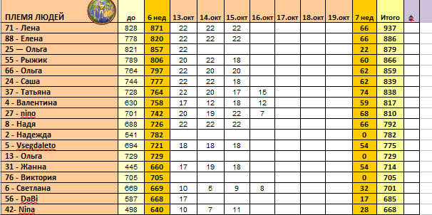 Люди 31за 16.10пп 7 (опять сладкое)спорт, джокер в пролете(((уход 1итого 8за 17.10пп 7 (сладкое)спорт, джокер нетуход 1итого 8за сегодняпп 1 (только вода.питание хреновое, ездили с сыном на экскурсию)спорт, джокер 0уход 1итого 2Вывод у меня такой: я только моюсь регулярно((( пичаль. Можно я поприсутствую на острове до конца марафонав качестве мебели? Хочу поздравить победителей и пожать им руки?))))