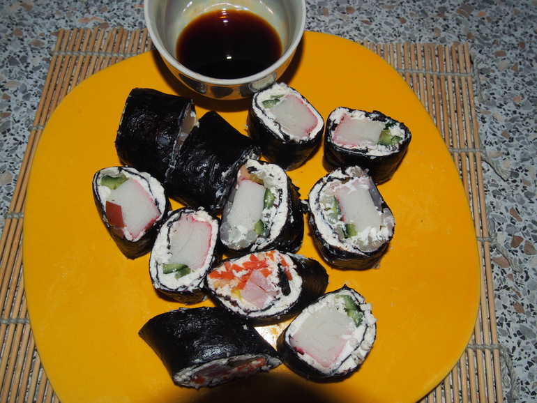 нори, творог и начинка, какую ваша душенька пожелает. На фото лишь маленькая толика, из того, что навертела. Были с крабовыми палочками, семгой, ветчиной, рисом ширатаки, огурцом и т.д.
