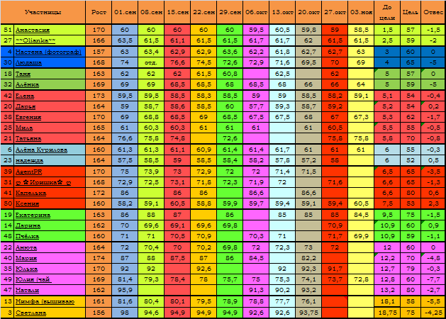 В голову пришла только одна мысль. Я решила поделить участниц на группы (для мотивации). Разделила я всех по оставшемуся весу до конечной цели и вот что получилось...