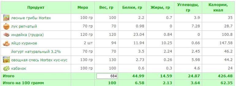 Всписке на сайте не нашла Овощей для жарки Хортекс по-восточному,поэтому нашла схожий продукт по БЖу и поставила его(кус-кус)