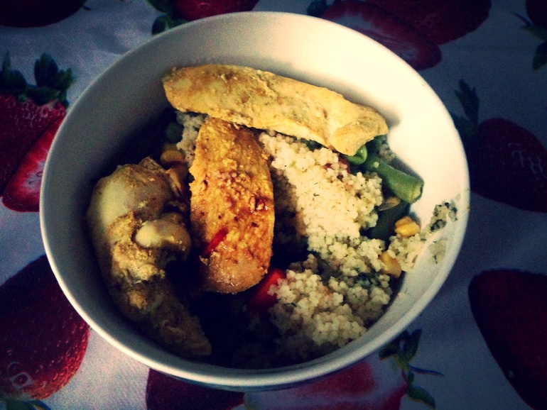 Кускус с травками, овощи замороженные тушеные, грудка в карри, перчике, лимоне, имбире и капле оливкового масла ...мммм.... Вкусно очень;))