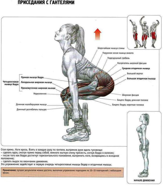 Всю книгу я оставляю на индивидуальное ознакомление в библиотеке, а сейчас то, что мы будем делать вместе по 20 раз каждое, количество подходов любое, в приседаниях вес не меньше 3 кг в каждой руке (это силовые, детка!):