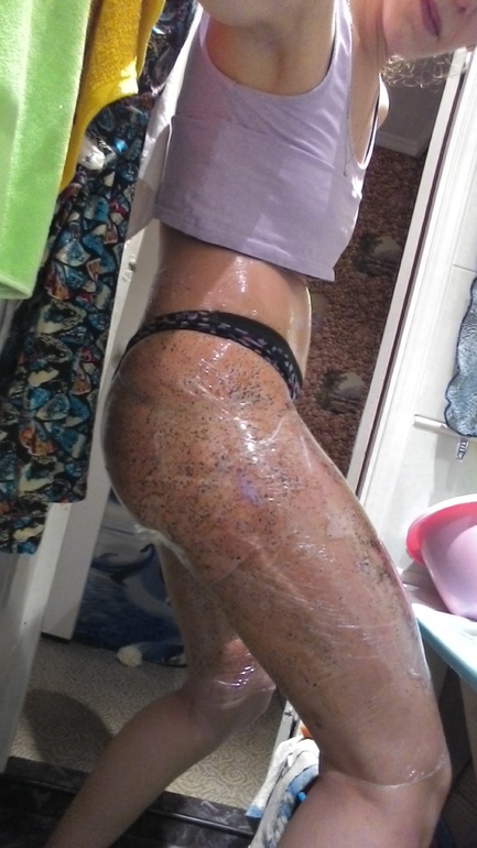 Растяжки, целлюлитПосоветовали мне тут девочки на бб ,скраб и обертывание.Вот намешала,помассировала после контрастного душа,замоталась.Сейчас стою раком за столом и ем))))Как раз время пройдет,пойду смывать)))Под катом фото не приличные)))))
