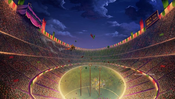 - Команды летают на мётлах над овальным игровым полем, в концах которого друг напротив друга стоят ворота в виде трёх круглых колец.