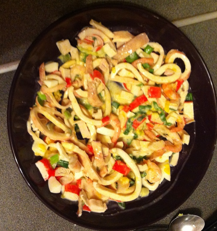 Креветки, кальмары, яйцо, крабовые палочки, зелёный лук. Заправка - 0% кефир с половиной чайной ложки горчицы и 1 зубчик чеснока. Очень вкусный и сытный.