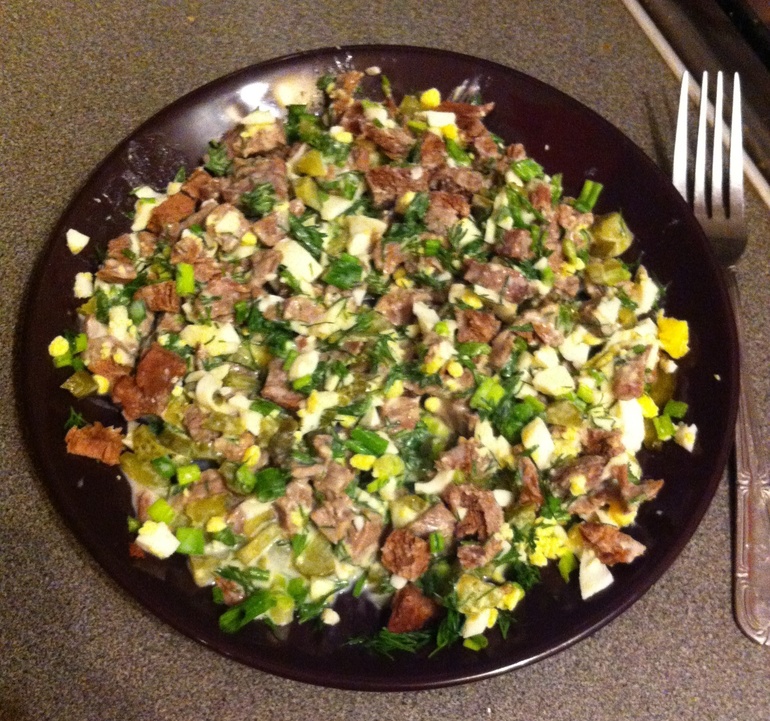 Ужин: салатик с говядиной, очень вкусный))) Ингридиенты: варёная говядина, яйцо, зелёный лук, укроп, 2 корнишона, заправка - 0% кефир (йогурт обезжиренный всё никак не найду.... он вообще существует??) с приправами, на ваш вкус и чуть горчички для терпкости)))