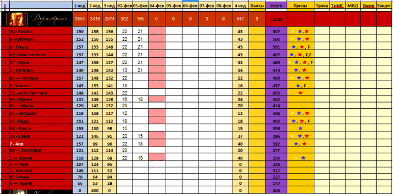 Турнирная таблица будет вывешиваться после 12 дня по Мск... если кто-то к тому времени не отчитается - его результатом будет считаться 0 и следовательно выбывание из списка претендентов.