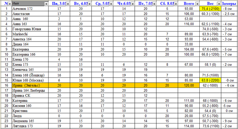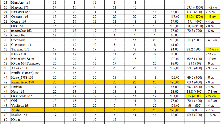 6 человек выбыло из гонки, я их из таблички удалила и поставила других девочек, чтобы таблица не расползалась - это всего несколько человек!
