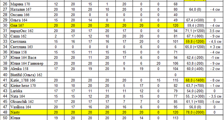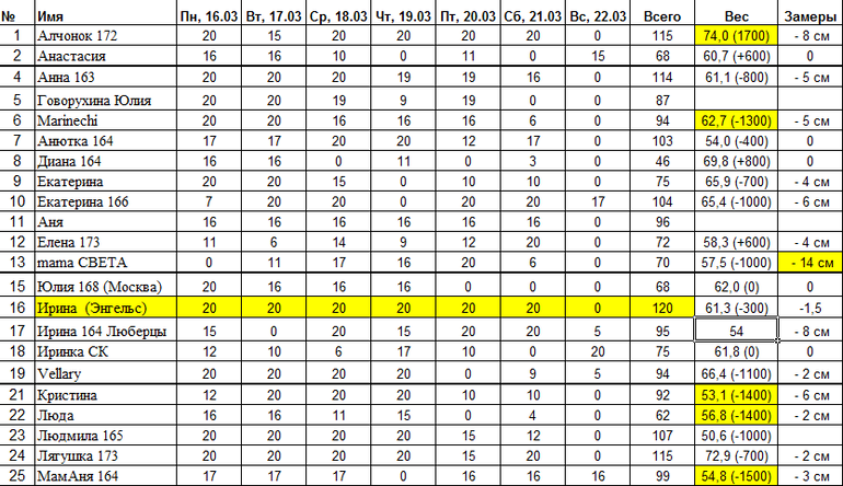 Не все девочки вовремя успели отписаться, киньте в меня свои циферки, внесу к себе в папочку - это нужно для того, чтобы в конце 1 фазы (т.е. уже в конце этой недели) я могла сделать итоговую табличку за месяц с нашими результатами!