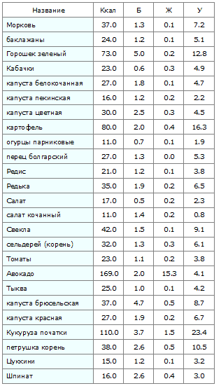 Для дополнительной мотивации и поднятия духа приведу таблицу калорийности некоторых овощей: