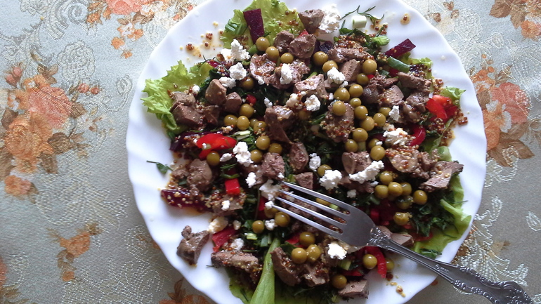 ЗОЖ и ППСпрашивала я тут недавно... и вот сообщаю. Состав: очень небольшая отварная свекла (проваренная немного, не варёная до победного), 1/4 красного болгарского перца, зелень, салатные листы на дне тарелки, печень куриная протушеная и нарезаная не очень мелко. Овощи нарезала полосками. Ещё 1 столовая ложка горошка. Заправка сок 1/2 апельсина и 1 ложка дижонской (французской, но не от Хайнц )горчицы. Всё раскладывала равномерно на тарелке, не смешивала, сверху заправка. Взяла для красоты и пользы 1 чайную ложку творога, размяла для красоты. Мне очень понравилось!!! Ккал не считала, но сытость хорошая)))