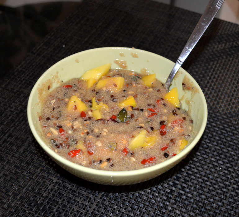 1 ч.л. семян чиа, 1 ст.л. семян льна, 1 ст.л. измельченного арахиса, 1 ст.л. тыквенных семечек, 1 ст.л. измельченных какао-бобов, 1 ст.л. сушенных ягод годжи, 1 ст.л. сушенной клюквы, мёд. Если под рукой есть свежие фрукты, то кладу и их. Сегодня это было манго, но и с яблоком получается не хуже.