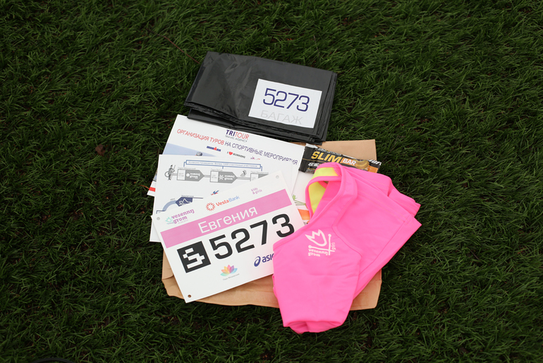 Поскольку для меня это Первый Старт - всё было в новинку )). Сначала я получила стартовый пакет с номером (на обратной стороне специальный чип, который отсчитывает личное точное время старт-финиш), маечкой и всякими бАмажками))