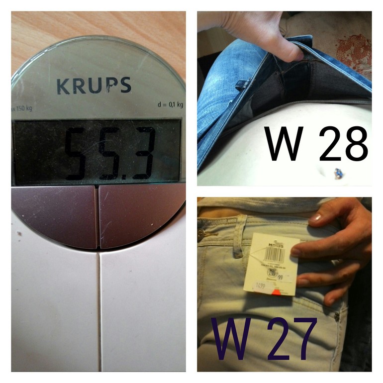 Дневники худеющихРаньше нижней границей был всегда 29й размер джинс.Меньше не было,больше было.Я так радовалась последний месяц,что купила себе 28й размер!И как они сидят,так была довольна!Но...Пришлось сегодня покупать 27й!Потому как вот