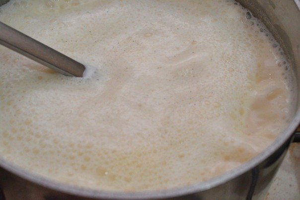 3. На сильном огне доведите до кипения, все время помешивая. Следите, чтобы молоко не убежало.