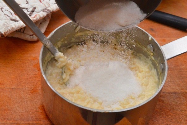 5. Добавьте сахар в готовый рис, стручок ванили выбросите. Хорошо перемешайте.