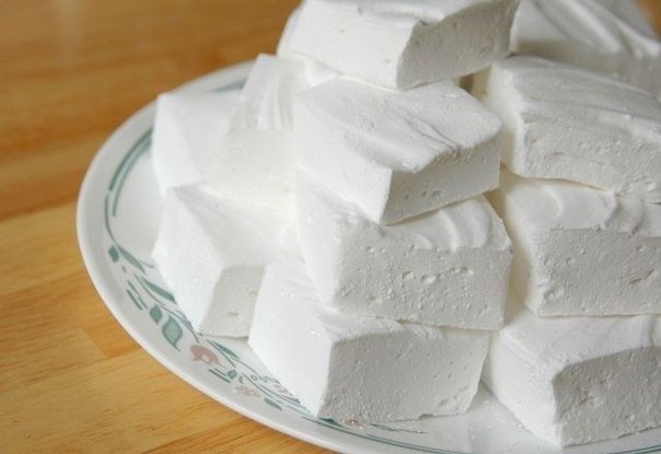 Взбейте яичные белки в миске. Медленно влейте желатин одновременно взбивая миксером на высокой скорости (взбивать около 15 минут). Когда смесь приобретет консистенцию густой пушистой пены и слегка остынет, перелить ее в неглубокую форму с антипригарным покрытием (чтобы было легко вынимать загустевшую массу). Другой способ: выложить массу на пергаментную бумагу. Распределите массу равномерным слоем и дайте полностью остыть. Охладите смесь, через 3-4 часа смесь загустеет. Разрежьте на 12 частей.