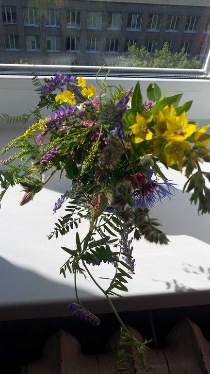 Привет всем! Вот такой вот прекрасный букетик цветов я получила от сына за победу в конкурсе по подтягиваниям. Счёт 6:18(!) в мою пользу. Ураааа!!! Правда надо говорится подтягивались не до подбородка ,а до лба. Сегодня будет конкурс отжиманий (нормальных).