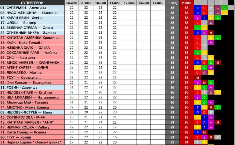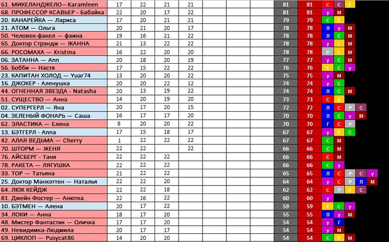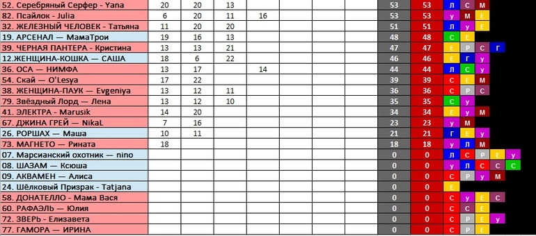 ТАБЛИЦА КРУТИЗНЫ СУПЕРГЕРОЕВ!!! если вы не обнаружили свои баллы, хотя вносили из в гугл=форму, или они не те что вы вносили - напишите Затане (Ann) в личку!!!